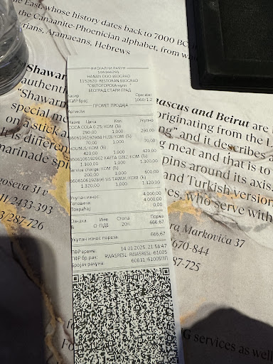 600 Rsd SERVICE CHARGE FOR 2 TWO PEOPLE. So, apparently this restaurant is spamming i think especially English speaking people customers in broad daylight. We were two people ate average food and then before closing which they do at 10 pm not 12 am asked us to pay which is fine, it is winters they want to close. The waiter said 4000 rsd without bringing the bill which is absolutely ridiculous it is fine dining restaurant to say the amount without bringing the bill is against law, which they did because they want to say pdv tax and not print the bill which might be fine for a small business or a restaurant but not a place which charges 1300 rsd for a meal. The most bizarre thing is yet to come, the waiter ofcourse didn’t expect i would ask for a bill because i knew it can’t be 4000 rsd, so the waiter when asked for the bill very cunning he added 600 rsd almost 20% (200*3) (which is clearly mention ) on the bill for 2 people in order to make the bill 4000 rsd so that we dont question him. I mean this so unprofessional and basically cheating the client. I believe in tips but this is clearly not the way to extract money. He clearly thought he would get away with this, oh because they are gullible foreigners and they can take advantage of them. Also, i firmly believe the owner of Hanan is behind this dubious scheme because i visited once before the service charge amount is not fixed, they charge it in order to make the bill round off , so the client doesn’t ask for any change but last time the waitress for nice and the food was good so i didn’t wanted to a jerk but this time it’s as bad as it gets. I hope tax and finance department of Serbia should look into this that so they give fiscal bill to the...