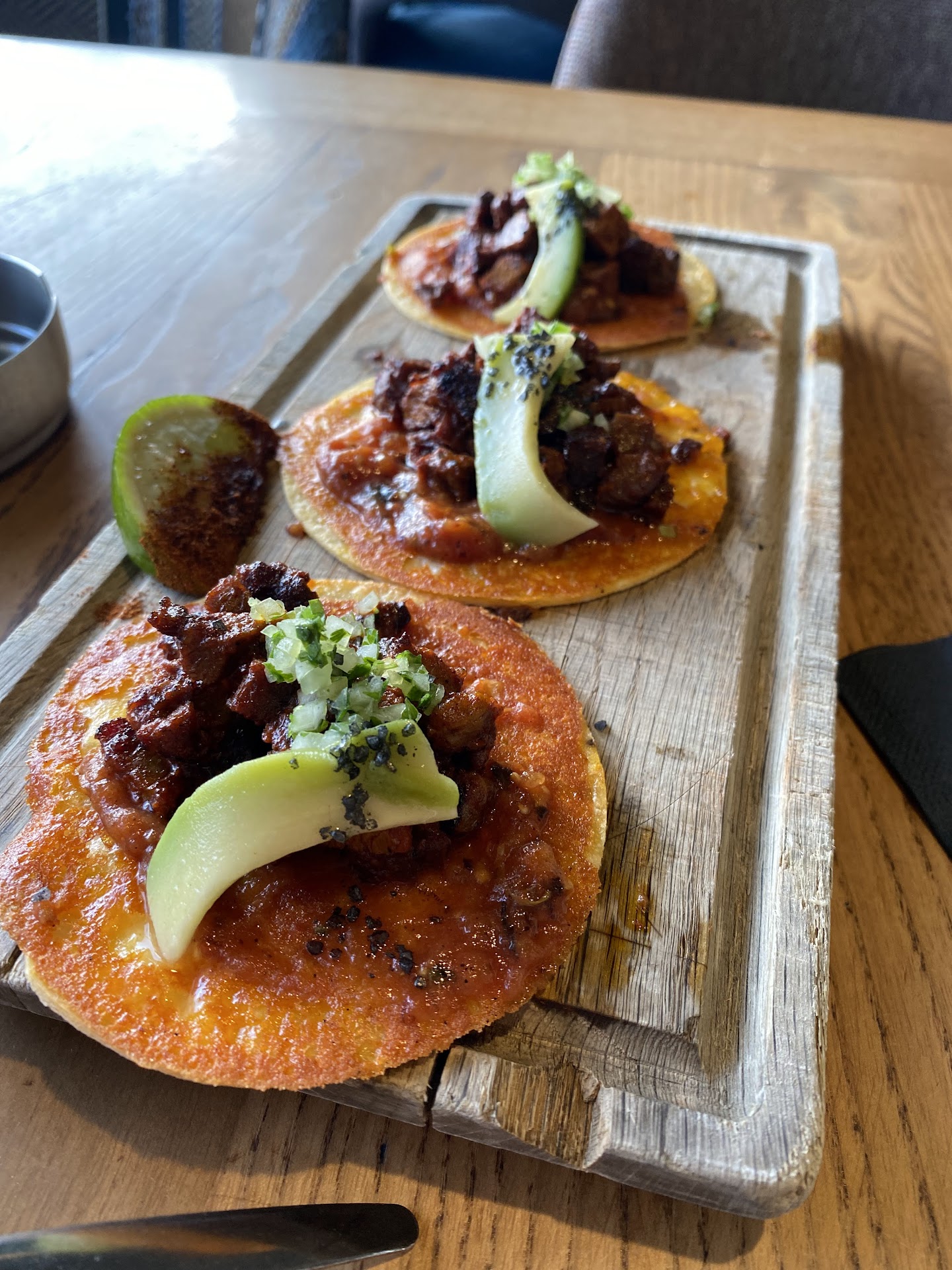 Fusion menu can be confusing - tacos and sushi side by side Tacos lack perfect flavor balance Chips, served with guacamole, aren't authentic Mexican fare Overall, while the service and atmosphere are impressive, the cuisine needs refining. The fusion concept has potential if executed with more focus.