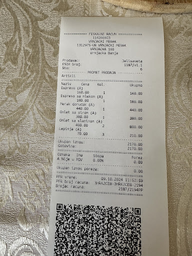 Овако, људи. Овде смо свратили на доручак. Ресторан се налази одмах поред главног магистралног пута од Краљева ка Врњачкој Бањи. Има паркинг. Лако уочљив. Амбијент је добар, ништа специјално. Фино изгледа. (Слике су злочин према уметности😅. Боље да их нема) Немојте се надати обедовању на тераси јер је ресторан тик уз коловоз. Велика бука. Само унутра. Особље врло професионално, културно, са манирима. Свака част. Похваљујем. Храна одлична, укусна, намирнице свеже, сир одличан. (Део омлета ухватила ватра, малени део. Загорео. Не замерам. Не утиче на укупни утисак.) Цена је малко јача него негде на ушушканом месту у Србији. (Београд не рачунам) Тоалет уредан и чист. (Ипак, оперете руке и морате да ухватите кваку...најбоље би било да су врата на гурање...) Све у свему, ако сте гладни и време је доручку, свратите. Препоручујем. Напомена: Ако не волите бели лук, скрените пажњу особљу да вам НЕ донесу лепињу посутом маринадом...