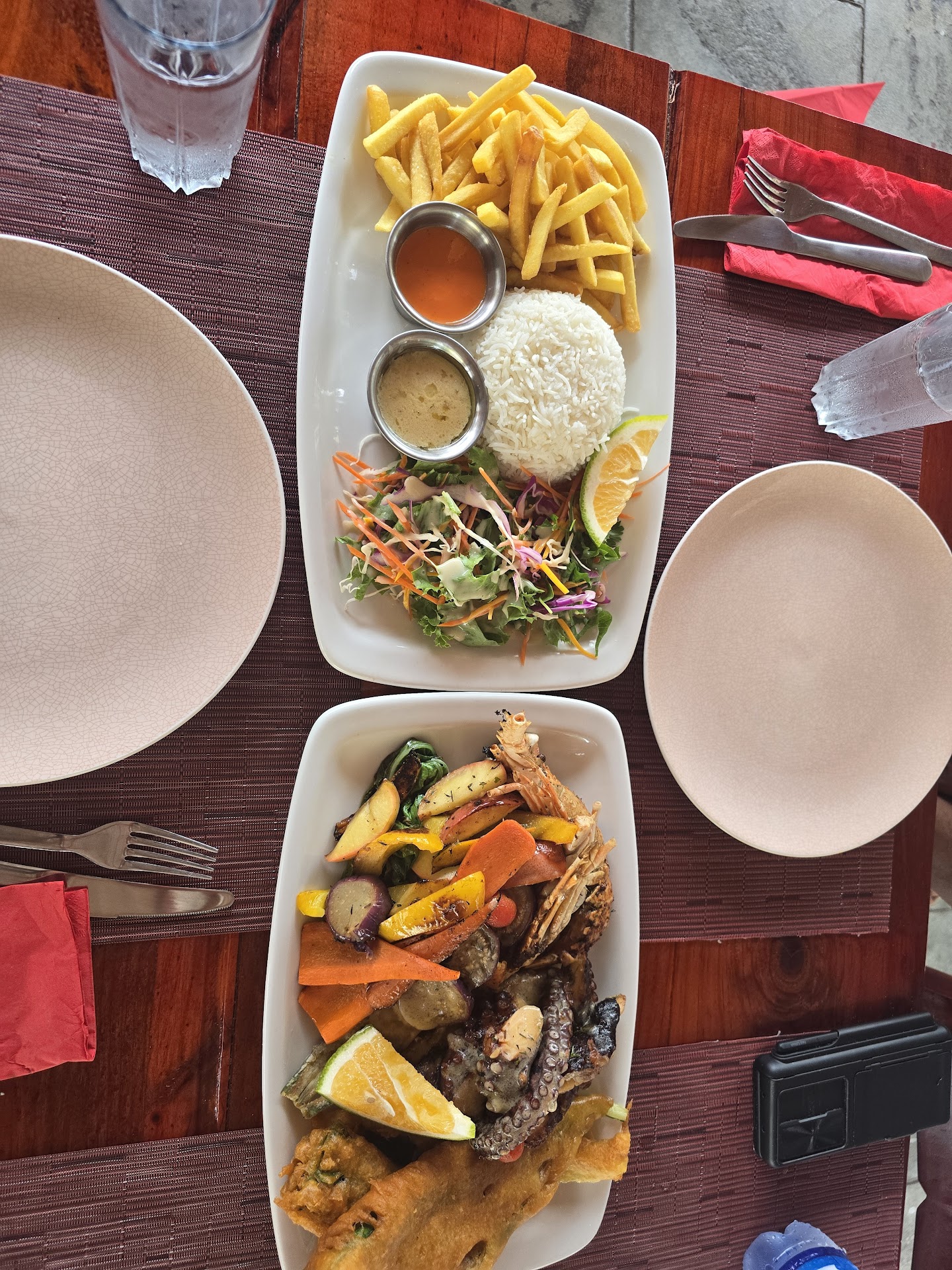 Read moreInstead of choosing one of the specials, we ordered a combo of it all! And let me tell you... all of the flavors of all of the dishes married together perfectly! Our platter consisted of rice, salad, and French fries. Also, a whole fish, a tuna steak, octopus, lobster, breaded and fried bok choy and steamed veggies...whew! If you're visiting from around the world, and you find yourself at La Goulue Café, just order it all!! I almost forgot. We also had the fish soup and spring rolls! Everything was great! Including Shana, our delightful server!! And did I mention that you could not only hear the waves, you could see the beautiful ocean???...
