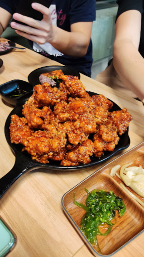 Taste: Our group of seven ordered two sets of full boneless chicken (which was actually just 16 pieces of chicken and not a "whole" chicken per se) in the Yang Nyeom (Sweet Mild Spicy) and Gan Jang (Salted Sweet) flavours, a kimchi pancake, a stir-fried squid and pork belly set and a pork kimchi soup set. Of all the food ordered, the fried chicken was definitely the best of them all. The succulent and juicy meat was enclosed in a crispy outer shell, which was then sufficiently coated in your choice of sauce. Each piece was also bigger than what any of us imagined. I personally preferred the Gan Jang flavour to the Yang Nyeom one, although the group had split opinions on which one was better. I do think that the Yang Nyeom flavour, while advertised as spicy with one chilli rating, wasn't actually spicy at all. What was spicy though, was the kimchi soup and the stir-fried squid and pork. The group didn't like those two as much, with the only positive being that the pork belly in both dishes were tender and that the pieces came in a significant size. The kimchi pancake was great though, and I liked that the edges were thin enough to be crispy. The fried chicken also came with pickled radish, which is sorely missing from many other Korean Fried Chicken places. It's great as a palate cleanser when you are switching between two constrasting flavours of chicken!