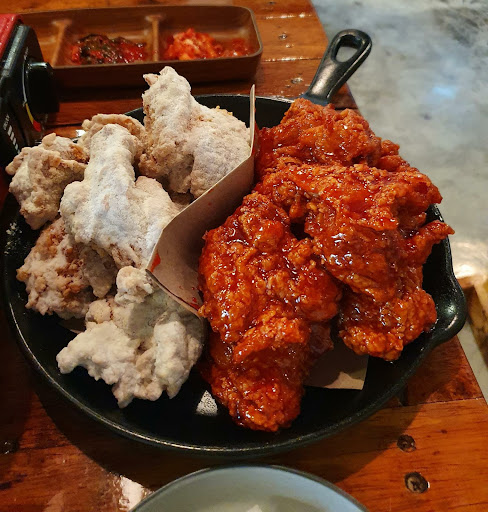 The honey butter is a dry power coating. The fragrance heightens the sensory while the crispy sweet coating satisfies the palate. On the other hand, the yangnyeon is generously coated in a wet sauce.