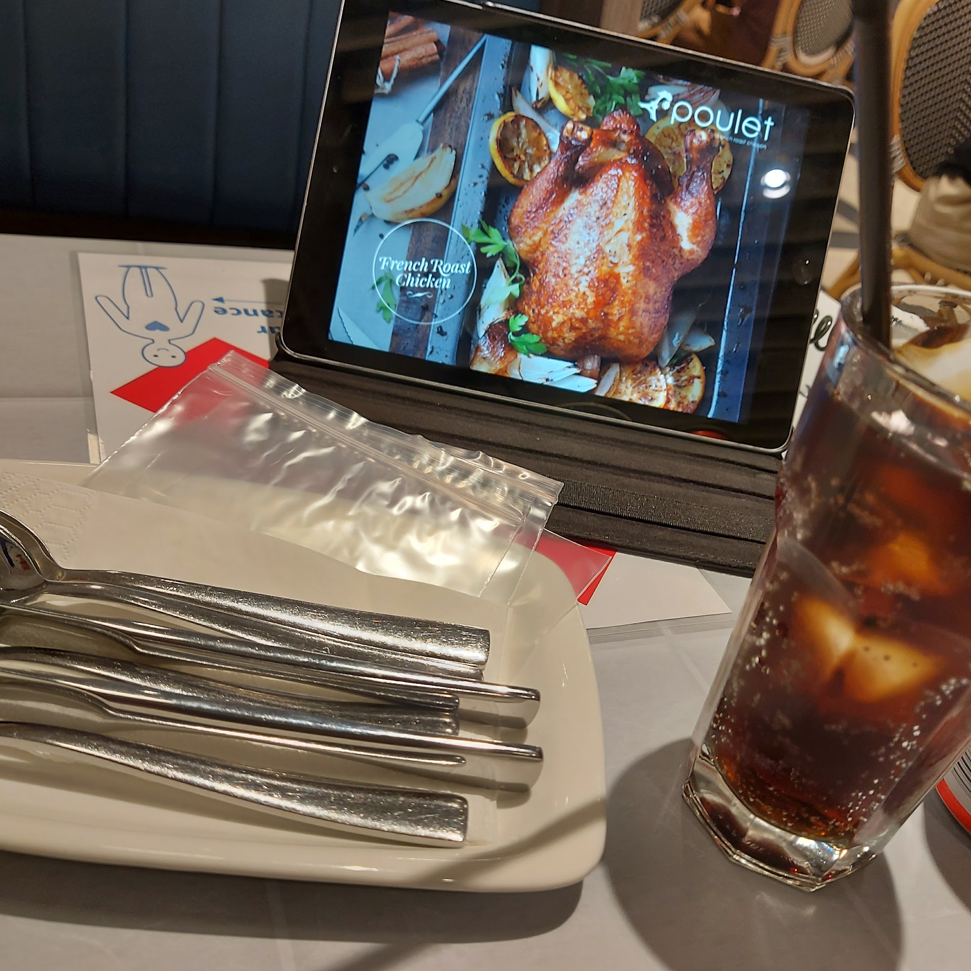 Walked around at the basement and came across Poulet. Nice French-ish inspired restaurant with island and booth seats. We were greeted at the door by a young male wait staff who politely took us to our seats. Prior to that, he took the initiative to ask if we are OK to seat side by side. Not a problem at all as it is the current social distancing situation. We were also given ziploc bags which I assume is to be used to store our mask. Now that's a great initiative.