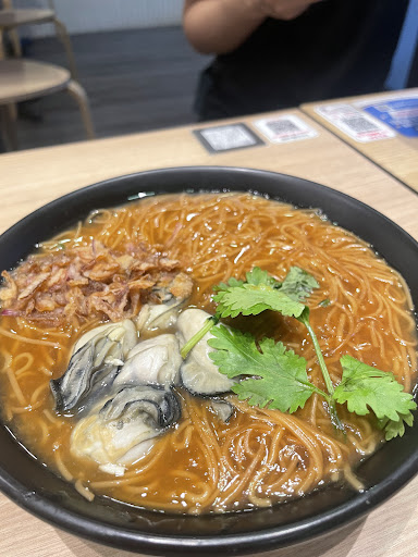 Oyster Mee Sua Red mee sua (vermicelli) imported from Taiwan, served with fresh oysters and braised chitterlings, topped with coriander and fried onion.