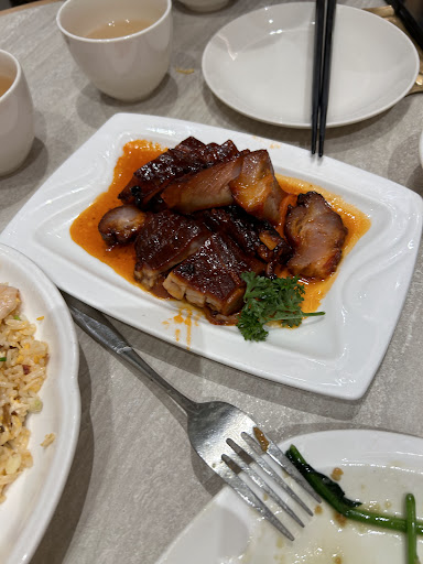 Culinary Highlights Roast Meats:** The charred BBQ pork with honey sauce features a slightly crisp, caramelized exterior with a moist and tender interior. The crackling skin on the roasted duck conceals a delicious layer of fat, enhancing the succulent meat.