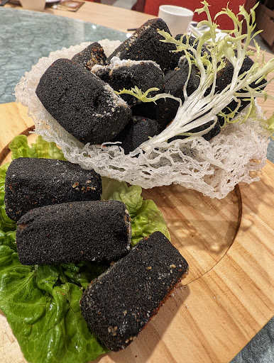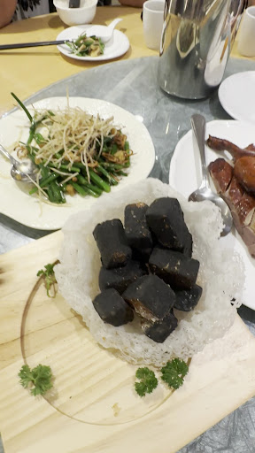 We sampled a variety of dishes, each showcasing the restaurant's commitment to fresh ingredients and authentic flavors. The Hanging Lettuce with Crispy Pork Belly was a standout, featuring perfectly cooked pork belly with a satisfying crunch and fresh, crisp lettuce. The Stuffed Aubergine with Minced Pork and Local Spinach in Abalone Sauce was another delight—the eggplant was cooked just right, and the sauce was flavorful and savory. The 60-hour Dry-Aged Roasted Duck was a testament to their culinary skills, with perfectly cooked, crispy skin and tender, juicy meat. The Deep-Fried Black Bean Curd with Shichimi Powder was a unique treat, and it tasted fantastic with a drizzle of duck sauce. The Wok-Fried Chives Flowers Hakka Style veggies were also a hit—crisp, flavorful, and a delightful addition to our meal.