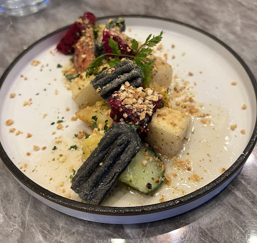Fortune Beancurd Bags with Vegetables • Tasteless fortune bags stuffed with bland vegan meat, carrots, and black fungi, served with unseasoned steamed broccoli. The side of fried bread crumbs felt like an afterthought and added nothing to the dish.