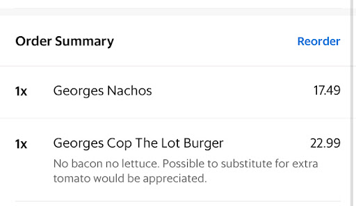 ย ย ย Read moreThrough Grab Food, I ordered the Georges Cop The Lot Burger on 10 March. Also ordered Georges Nachos. The nachos were very good. The chili that came with it was nice and the cheese that was melted on the chips I could tell was real and good quality cheese. It also came with some sour cream which is nice to dip.