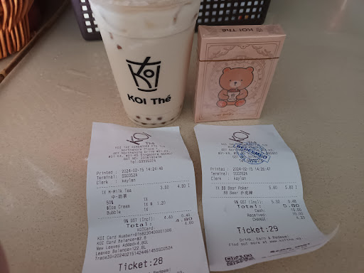 Read morehi i ordered from koi northshore yesterday and i know it's partly my fault but i saw on instagram that the poker cards were sold out so i didn't think of asking about it. afterwards i saw a few boxes under the cashier so i requested to get a box. however, since i got it only after the transaction was made, i had to pay alacarte price as i was the only one to drink the drink. being very tired that day, i didn't think much. but when i reached the lrt station, i realised that perhaps i could request a change in transaction (i work at a bbt store too so i know it's possible) so i could get one large cup of the same and add on $2.80 and walked all the way back to koi only to hear "i don't think we can do that" from tbe cashier quite rudely and since i was so tired i didn't bother to enquire further and left. total spent $10.60 when i coukd have just spent $8.30. hope to get...