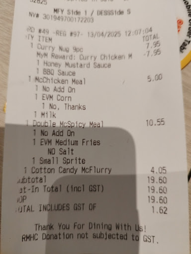 How come nowadays always missing item ?! I paid full price but always missing item . Not only 1 or 2 times now is anlready 3times so I must make a feedback to McDonald . Especially order in grab food we cannot bring back receipt on the spot to store claim it . So for me I will feel like McDonald no respect to customer …