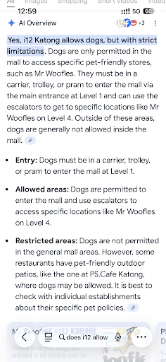 Read moreTotally not pet-friendly, despite what you may read online. Most posts say small dogs are allowed in the mall (in prams) and can access cafés like PS.Café (level 1) or Mr Woof on Level 4. So we brought our dogs in a pram, thinking it was fine.