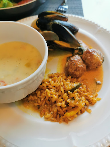 Other buffet items included a pasta dish, two types of baked potatoes, chicken meatballs with spinach, mussels and clams in curry broth.