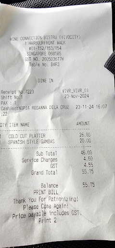 Read moreI just visited Wine Connection at VivoCity and was extremely disappointed with the service. From the moment I walked in and seated myself at the bar counter, the staff seemed disinterested and busy with nothing. I know the trend, so I scanned the QR code to place my order, which was a bottle of their wine of the month, NEPENTHE Pinnacle Chardonnay 2021 - Adelaide Hills, South Australia, Gombas, and a cold cut platter. Food was served at the usual waiting time, but the wine had not arrived, so I asked the waiter to bring it. In a short while, another waiter approached me and told me that the wine I had ordered was out of stock. He informed me of this and suggested that I choose another wine, which I did. I scanned the QR code to order a bottle of Alsace - France WOLFBERGER "Signature" 2022 - Riesling - Alsace - France.