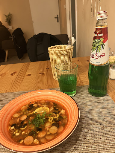 We had a pretty bad experience here, unfortunately. The beer I ordered and the eggplant rolls were out of stock. I proceeded to order (the more expensive) other beer (a czech Radegast) but got a Staropramen. Alright, nothing too bad, I guess. We ordered Khachapuri (cheese cake) for starters and Ojachuri and vegetarian Vareniky with mushroom and potatos and ordered sour cream to it (which costs extra). The vareniky even had a plant smybol (look at the pictures I posted). You cannot tell me that doesn't look like it's vegetarian lol. The Khachapuri never came and then to our surprise, the vareniky had loads of bacon over it. We told the waitress about our confusion and she apologized and told us to wait five minutes. The food then came back and they only removed the bacon bits. Although it still tasted completely of bacon fat we thought "at least, the food didn't get wasted" and proceeded to eat it. Needless to say we found around 6 bits of bacon still in the food which is an absolute no go if you ask me. Oh also, they forgot the sour cream so we had to ask for that again. Then chapter 2: we ordered 100 ml of white wine (on the menu is an option for a bottle of 750 ml or for a glass of 100 ml). We got around 200 ml and thought thats nice because its often a bit more than what is said in the menu. After our disappointing experience (the food we got was good apart from the problems) we went to pay at the bar. First the waitress even cashed up the Khachapuri that never came and we told her, that we didn't get that. She apologized and went on to cash up the rest which was around 4€ more than we ordered. I asked how she came up with that price and after some forth and back she admitted that she cashed up 2 glasses of wine (2 times 100 ml). I explained to her, that we never ordered 200 ml and she said "but you had 200 ml". If I wasn't so shocked, I probably would have laughed. You cannot just bring more food than someone ordered and then proceed to cash that up lol. I refused to pay the inflated amount and she at least gave in. All in all a pretty bad experience because it left us in a bad mood because the waitress even shamed us into feeling like we...
