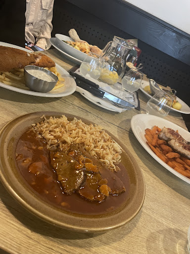 I had the Roasted beef leg in red wine, and it was delicious—tender and full of flavor. The chicken broth was really good too, with a nice amount of chicken, which you don’t always get in other places. Presentation could be a bit better.