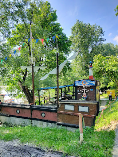 A popular refreshment bar (beer, kofola, snacks), in a style of an ancient steamboat - next to a bike trail. In the middle of the city, but in a quite natural (almost wild setting). Surrounded by watersports facilities, frequented by the cayakers, canoeists, bikers, or neighboring districts' inhabitants. Low budget but in a quite picturesque setting, almost romantic, with possibilities to sit and indulge next to a quiet river arm, or even on the boats that are part of the establishment. Watch out of...