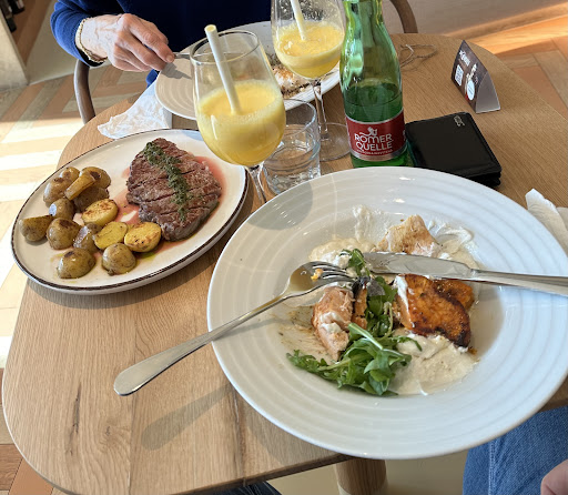 Perfect location with view of the river Danube and located in a mall with free parking Very cozy, stylish ambience enhanced by huge palm-like plants inside, quality interior furnishings and fancy espresso equipment (Victoria Arduino at its best :) ) All staff were very friendly, fast and polite The salmon and the chicken were both very tasty, mellow and presented in a creative way