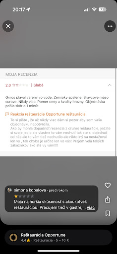 Read moreMoja najhoršia skúsenosť s akoukoľvek reštauráciou. Pracujem tiež v gastre, presnejšie v pizzerii, mam alergiu na múku, a kedže my bezmúčne jedna nemáme, vždy si obed niekde objednám. Objednala som si jedno, presnejšie menu z tejto reštaurácie, kde som bola totálne sklamaná. Gyros bol varený a plával v oleji, zemiaky boli spálené. Druhé jedlo bola bravčová panenka, ktorá bola úplne surová. Napisala som recenziu na bistro, pretože to bol naozaj des, a dostala som odpornú odpoveď pravdepodobne od majitelky reštaurácie, že si mám jesť naše jedlo z reštaurácie, a že mi objednávku ani nemala potrvdiť. Ja by som nikdy nedala neoprávnene recenziu, ale to, čo mi priniesli za jedlo na pochvalu nie je. Čiže prístup tejto Pani/ Slečny je hrozný. Treba prijať kritiku a zároveň si z nej niečo vziať a nie útočiť na ľudí, ktorý iba vyjadrili názor za jedlo, ktoré si...