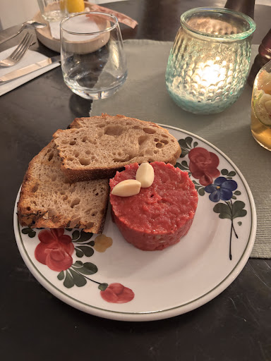 As for the food, I ordered the beef tartare, and the portion was impressively large (I actually felt there wasn’t enough bread, which is quite rare for me). The standout dish was the veal liver—despite usually not being a fan of liver, I found it absolutely incredible. The creamy mustard sauce with stewed red onions was a revelation, and the roasted potatoes complemented it perfectly. The traditional “bryndzové halušky” also lived up to expectations. Overall, the food was excellent.