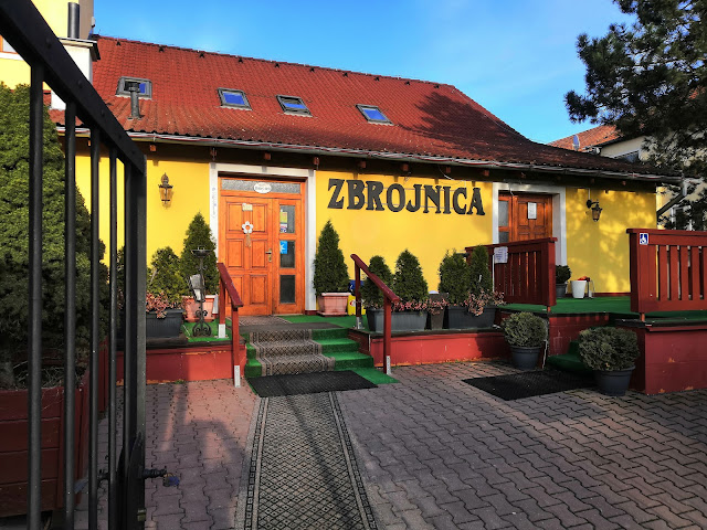 Do Zbrojnice sme sa samozrejme vydali najmä kvôli jej majiteľovi Jožovi Pročkovi, ktorého sme tam stretli, takže návšteva účel splnila, ALE... Interiér reštaurácie od farebných stien po stoličky sú čisté deväťdesiatky, ale budiš, niekomu sa to môže páčiť, každopádne je v reštaurácii strašne málo svetla. Teráriá s plazmi a obojživelníkmi podľa mňa tiež do reštaurácie nepatria, ale evidentne dobre zabávajú deti a táto reštaurácia je rozhodne kids friendly, takže aj s tým sa dokážem zmieriť. Postupne sa však dostávam k veciam s ktorými sa v žiadnej reštaurácii zmieriť nedá a to je zlý personál a podpriemerná kuchyňa. Napriek tomu, že boli v reštaurácii obsadené 3 stoly sme čakali na obsluhu dobrých 15 minút, pretože sa slečny čašníčky rozprávali za barom. Servis bol fakt podpriemerný (nepriniesla dosť príborov ani servítky, ak teda nerátam tie, v ktorých bol príbor zabalený, čo je fakt des), zabudla na niektoré veci z objednávky a ešte k tomu všetkému na nej bolo vidno, že ju práca fakt napĺňa :) objednali sme si kapustnicu, ktorá bola vlažná, to vsak nebol až taký výrazný problém, chuťovo bolo veľmi priemerná. Ako druhé sme zvolili panenku so šalátom (bohužiaľ žiadnu panenku sme nedostali, ale bravčové rezne na prírodno a k tomu kus surovej kuraciny, mimochodom šalát ako príloha bol fakt odporný), soté so zemiakovou plackou (k chuti sa ani nevyjadrím, vyzeralo to ako už raz strávené, proste si to nedávajte) a pizzu (okrem toho, že pizza má názvy a popisky zodpovedajúce kvalite humoru majiteľa, to bolo rozhodne to najviac požívateľné jedlo, ktoré nám pristálo na stole). Ako som písala v úvode, mali sme šťastie a majiteľ bol v reštaurácii prítomný. Pročko je priateľský a s každým kto má záujem sa aj odfotí, okrem toho rozpráva kopu nezmyslov a vlastných múdrostí, takže pre milovníkov bizarnej zábavy super, pre bežného nič netušiaceho jedinca, ktorý sa chce iba najesť je to silné kafe ochutené pocitom neskonalej trapnosti - tak tomu bolo aj pri našom stole, polka mala z toho fakt zábavu, druhá iba nasucho prehĺtala. Keďže sme si čítali vopred recenzie na Zbrojnicu na FB veľmi dobre sme vedeli, že pán Pročko akúkoľvek kritiku odmieta, preto sme proste to čo nám nechutilo nezjedli, bez reklamácie (koniec-koncov ako som už spomínala, kvôli jedlu sme do Zbrojnice primárne nešli). Dávam dve hviezdičky, lebo chalani sa zabavili :) Odporúčam len ak nie ste náročný stravník, prípadne ak vás zasýti humor...