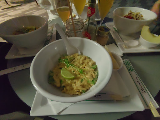 Delicious food with an authentic taste, prepared quickly and with fresh ingredients. Service fast and discreet . Shame about the impractical very deep bowls with short spoons. Portions were large but not too big. Highly recommended for lovers of Asian cuisine. I would still like to see a ban on smoking on the terrace. The smell really spoils the enjoyment...