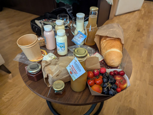 Very good and delicious selection of regional food. Order and delivery very convenient. Basket was placed in front of our door at the agreed time. Short notice came via text message. Content of breakfast basket: croissants, bred, yoghurt, granola, fruits, juice, salami and cheese, free range eggs and fresh raw milk, honey and marmelade. So far no vegan or vegetarian order possible (e.g. oat or almond instead of dairy products) which we would have appreciated.