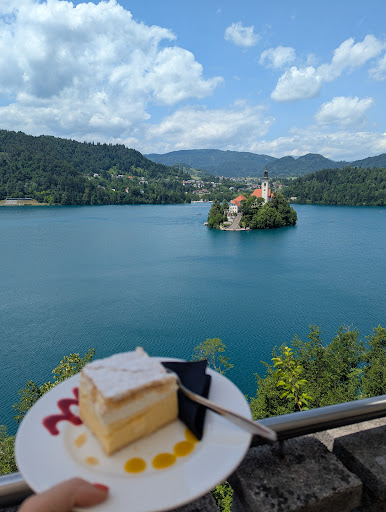 Read moreBeautiful views a perfect spot to have a cafe. We had bled cake and a coffee. We were sitting outside and unfortunately there was only 2 cushions for all 20 chairs, the tables all had other customers rubbish on them and all needed a wipe. We felt like it's such a beautiful spot for a cafe but was really let down by the service. There wasn't table service so we just had to go and try and find a member of staff to ask, and the menu only consisted of drinks and ice cream and bled cake which was perfect for us but a lot of customers had left because they wanted more. The bled cake was lovely, more pricey than other places but the view was worth it. You can drive here but also walk up from the lake bled walking path too...