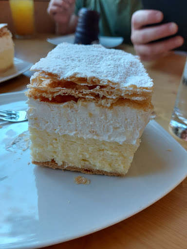 Now we didn't know anything about Bled cake prior to coming to Bled but once we got there you couldn't escape it and to be honest I am thankful for that. This is a small local place out of the centre on a nice residential road that we walked past and we noticed it was mainly locals inside so we thought we would give it a try. It's what you would expect from a local shop it's nothing overly fancy however it's everything tasty. You order at the counter then grab a table which I am happy about but making a decision on what to order is the most difficult part. I went for the Bled cake then we also got a fruity cake. The bled cake was brilliant tasted fresh and home made and really good texture and ingredients. The other cake was delicious really tasty again it tasted like it was home made and bursting with flavour it was also really light and didn't leave you feeling like you have had a gallon of sugar afterwards. We also got some coffee which as every coffee we tried in Bled was brilliant it seems to be a good town for getting coffee in. Service was friendly and we had a table in the outdoor area which was nice it just has a really nice friendly feel to the venue. The toilets aren't for those of height or size down a thin circular stairs but that adds to the fun. All in all a really good place to grab an outstandint cake or ice cream and enjoy a coffee at a reasonable value away from the...