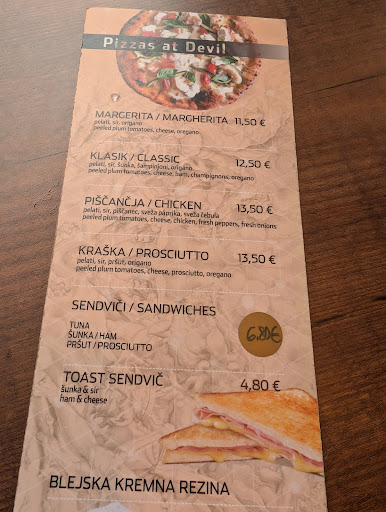 Read moreOn a rainy night in Bled we found out that restaurants all over town required reservations and ended up taking the last open table at the lakeside bar called Devilâs Pizza. Itâs a lively place, with a friendly server and an extensive drinks menuâone of the few places that has offered Tequilas in this part of the world. The kitchen serves food and I was hopeful of salvaging dinner. There were 4 very simple pizzas on the menu and 2 sandwiches listed: ham & cheese and tuna, but the kitchen was out of tuna. We ordered the Klassik/Classic pizza which was topped with ham and cheese-- so basically got an open faced ham and cheese sandwich, and it was as mediocre and forgettable as a frozen pizza. Itâs clear that people donât come here for a culinary experience, they come because the evening view over Lake Bled with the Castle looming above it is...