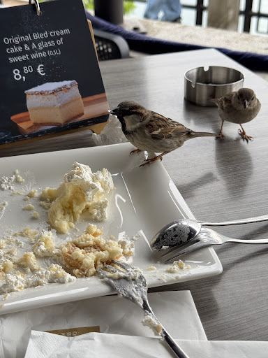 When we sat ourselves, we ordered a couple of drinks (beer and aperol spritz) and decided to have their traditional cream cake despite having dinner reservations elsewhere shortly after. Definitely worth trying as it was rich, creamy but not too heavy. It was served by a "robot" who carried the dessert to our table. Total cost about 17€