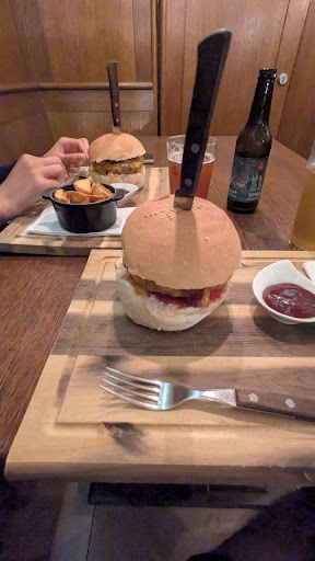 Well, positive things first: The bun was really good, fluffy but firm, so it was holding the burger nicely together. The patty was also great, fresh meat perfectly grilled on point on the green egg - really big potential here! Cheddar & bacon were also lovely. But we've had one big issue unfortunately - the sauces. First of all, bbq sauce (out of the tube in this case, not homemade) should never be served as default dip for wedges (also convenience - not selfmade), the sweetness just doesn't fit to potato products. Instead, I would love the homemade aioli much more, or even sour cream or creme fraiche. At least the customer should be asked what dip he/she prefers. Secondly, the sauce constellations of the burgers are too much, some of them have 3, 4 or even 5 sauces on it, why? Thi is way too much, in the end you won't taste any of them. Mustard on the burger with aioli was also not a good combination, the taste of the mustard was just too strong and the aioli was totally disappearing. Also for the crunch & freshness I think any burger should have some lettuce on it by default, but this is probably my personal taste. Overall 3,5 stars, the burgers could be amazing if the sauce issues would be solved. (Less is more, fresh self made sauces and no bbq sauce for the...