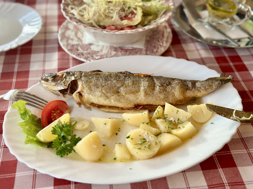 We had dinner here, ordering the trout with trieste sauce for mains, with a salad, and apple strudel for dessert. As others have said, the food is homely and mostly good. The fish was cooked well and the highlight of the meal. The potatoes, boiled and buttered, and the salad, an assortment of vegetables, were nice and simple. The letdown of the meal food-wise was the apple strudel - this underbaked and as a result, stodgy and doughy. We were particularly disappointed as this was supposed to be the dessert special of the day. In terms of service, the waitress was very friendly and welcoming, however, being the sole server on the dinner service meant we were left waiting for long periods of time without attention (as were many other tables) even though she was literally running around doing her best. This could be easily remedied by having another member of staff during busy...
