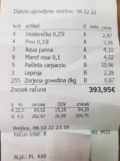 Read morePOZOR !!! DEBELUH - NATEGUN - ODERUH !!! ŽE TRETIČ POSKUŠAM PODROBNO NAPISATI OBUPNO , GROZNO IN NEPRIJETNO ISKUSTVO PA ME VRŽE VEN !!! Preporočilo od osebja Hotela Terme Čatež 😏 Najgrjša in najslabša pojedina kar sem ih v življenju poskusiu , odpeljal sem poslovne partnerje in sam ostal posramljen , oni pa vidno razočarani !!! Dokler niso bili prepričani da smo res prišli na večerjo , niso imeli proste mize za pet (5) oseb. Jedilni list nismo dobili ker večino jedi po besedah katakarja nimajo , samo tisto kaj oni trenutno priporočajo ! Sprejeli smo preklog in naglasili da nismo preveč lačni ampak da smo prišli nekaj okusnega in slastnega pojesti. Dobili smo kot preporočeno, slastno popečeno zorjeno govedino , katera se topi v ustih in je odlična ... Dejansko pa smo dobili kot predjed - pašteta carpaccio ( nič posebnega ali vredu ) , za tem ... dobili smo vsak od nas po majhen krožnik in Tri velika kosa mesa z kostmi vsak na svojem pladnju (skupaj 2,55 kg) ! Trenutno in zelo malo od zunaj popečene , žive , žilave , brezokusne ... Poskusili smo in vrnili vse da meso popečejo ker tako ni užitno ! Prinesli so nazaj mal bolj popečeno , žilavo , trdo , brez okusa , katastrofa ... Več kot dve tretini je ostalo ker kljub vljudnosti , noben ni več bil lačen ... ( ljudje tega niso želeli , ker je obupno ). Jaz sem ostal posramljen in brez besed ... !!! Ta njihov "SPECIJALITET" - tri kosa skupaj 2,55kg stane natanko nesramnih 221,85 eura !!! Skupaj račun za pet oseb 393,95 eura ZA NAJSLABŠO POJEDINO V ŽIVLJENJU !!! Po tem sem posramljen , odpeljal svoje vidno razočarane partnerje v Zagreb na resno okusno večerjo ! NIKOLI VEČ...