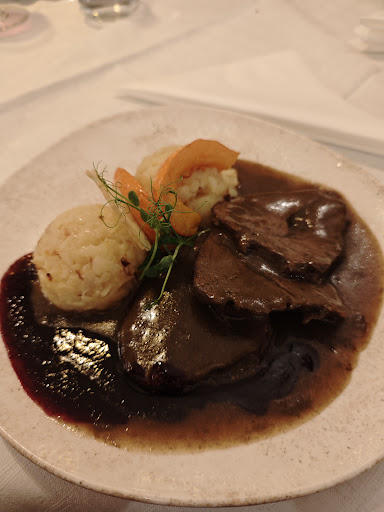 Gobova juha je delovala, kot da so jo malo zredčili z govejo, brez okusa ter redka. Glavna jed povprečna oz. takšna kot jo pričakuješ. ko jo naročiš, pač okusna in pravilno pripravljena. Kar pomeni precenjena za to ceno. Solata prezačinjena z oljem. Presenečenje je, ko dobiš račun, ko misliš, da poznaš ceno, pa ti posebej zaračunajo vse priloge, ki naj bi bile ob glavni jedi, kepa krompirja 5€ zapovrh. Torej predstavitev jedi pri postrežbi je zelo zakomuflirana, kaj dobiš in kaj na koncu plačaš. Pazite, če naročite Gin-tonik! Cena je zavajajoča, tonik zaračunajo še naknadno! In lahko dodam, da smo imeli večina težave še 2h po večerji s prenapihnjenostjo... Upam, da mi ne bo treba nikoli več tja, bili smo...