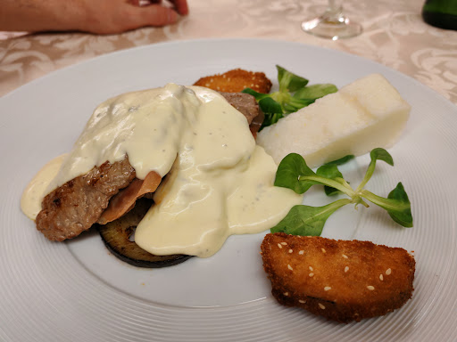 Cibo d'alto livello, siamo andati proprio in un buon ristorante. Lo consiglio a chi preferisce degustare cibi particolari 😉 Ambiente molto curato, più da ristorante che da semplice gostilna secondo me, abbiamo preso gnocchi di zucca (8€), gnocchi di castagne al sugo d'oca (8€), bistecca alla Dalmacija con porcini che sarebbe un roastbeef ripieno con prosciutto e formaggio ai ferri con porcini (14,50€), rane fritte (12€) e lumache con pancetta alla griglia (8,50€). Un buon mezzo litro di merlot, mezzo litro di radenska e 2 caffè abbiamo pagato in tutto 61€. Allego foto del menu e del scontrino 😃 Gnocchi di casa veramente molto buoni, interessante l'accostamento lumache e pancetta anche se secondo me la pancetta alla griglia copriva abbastanza il gusto della lumaca ma comunque molto buono, rane fritte giganti piene di polpa 😃 Questo locale è più per degustare cibo particolare, non tanto per abbuffarsi, mangiato molto bene ed è giusto pagare un pelino di...