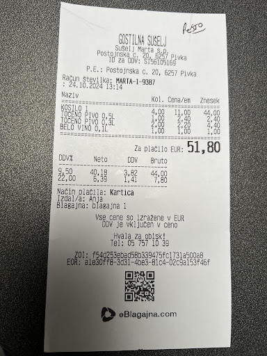 Read moreTo mesto imamo res radi. Lahko bi rekli, da je to najboljša restavracija v Sloveniji, saj je vse, kar smo jedli, preprosto izvrstno. Hrana je obilna in porcije so velike, poleg tega pa je cena zelo ugodna. Vzdušje v restavraciji je zelo prijetno, osebje pa je vedno nasmejano in prijazno. Tudi gostje so vsi prijazni, tako da se človek počuti, kot da bi obiskal družino ali prijatelje. To je restavracija, v katero bi radi hodili vsak dan, in res smo srečni, da smo jo odkrili. Čas, ki ga preživimo tukaj, nas vedno...