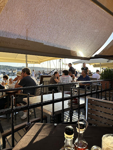 Purtroppo è stata una pessima scelta mangiare qui anche se ci sono recensioni positive lasciate da persone che non sanno cosa vuol dire mangiare. Posto turistico sul porto con tavoli all esterno. Appena arrivato il cameriere dice di sederci dove vogliamo. Il primo tavolo aveva una tovaglia marrone il plastica sporca di polvere bianca. Cambiamo tavolo e la tovaglia in plastica ha un buco di sigaretta. Chiediamo di cambiarla ma fanno finta di non sentire. Così cade L occhio sul oliera che ha i tappi cromati tutti scrostati. Le bottiglie di vetro forse non vengono lavate da 1 mese perché sono sporche e unte. Per non parlare dei menu che erano consumati sia all esterno che all interno. Tovaglioli di carta e bottiglie in plastica come al supermercato solo da 0,50 litri. Ti portano le posate su un piatto tutto e tu devi prendertele. Non le mettono loro su ogni posto. Mai capitato prima se non alla fiera di paese! Spesso i piatti o termine sono sbeccati in vari punti. A noi anche 3 punti spaccati in un solo piatto. Ma è un ristorante o una mensa del carcere? Le tovaglie non vengono mai cambiare tra un ospite e L altro. Resta quella per tutta la sera e forse anche il giorno dopo. Pulizia voto zero. Ordiniamo una pizza che faceva schifo. Cotta nel forno elettrico. La "mozzarella" è un formaggio tipo sottiletta o altri misti che facevano schifo. Ordiniamo spaghetti alle vongole. Arrivano linguine alle vongole. Una pasta cotta troppo come in una casa di riposo. Ma ancora peggio è che le vongole non sanno da niente e sono ricoperte da una salsa al pomodoro e panna che rendeva il piatto immangiabile. A fine piatto c era sul fondo un sugo che nemmeno nella pasta al pomodoro rimane così. Ordinato calamari fritti. Porzioni grandi ma la qualità è bassissima. Il pesce è surgelato. La polpa del calamaro è molto fine e si sente solo la frittura molto unta. Ordiniamo calamari alla griglia. Piatto che sembra bello ma ancora il gusto del pesce non esiste. Calamari che non riuscivamo a masticare immersi in un liquido di olio con un gusto di burro. È vero che le porzioni sono abbondanti ma il pesce è tutto surgelato e senza gusto. Il sugo rosso viene usato ovunque anche sugli spaghetti allo scoglio. Non si può pagare con la carta di credito ma solo contanti. Assurdo. Locale pessimo. Non andateci è una truffa per turisti. Più che un ristorante sembra una mensa per anziani. Nemmeno ad una sagra si mangia così male. Locale che in Italia sarebbe già chiuso sia per qualità sia per controlli di igiene. Concludo dicendo che mangio ovunque e lascio sempre 4/5 stelle ma questo locale davvero è da zero stelle. Nemmeno in Serbia o Montenegro ho mangiato così male e uno sporco simile.