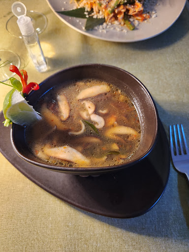 The Papaya/Mango Salad - watery, no dressing, no fish sauce or spice at all.. some broken helpless almonds instead of peanuts or cashews, simply no taste at all. The waiters answer: „I could ask the kitchen for a dressing- 5 minutes later he told us they could not make it and he knows it is quite watery“. Wow.. 2. The sweet and sour sauce, smoky yes but completely sugarfree, just acid plus smoke? aroma.- the waiters answer: „just nothing, he could ask for sweet and sour in the kitchen but this is how it comes“. And no it was not that deliscious and easily made fishsauce/vinegar/sugarsauce mix that is known in Vietnam as well. Not at all. 3. The PadThai - sticky and colorless like glue and pudding, surrounding by noodles, high acidity, taste like a 1$ chicken soup, no sort of any typical authentic taste of a well cooked Pad Thai - no Love no nothing. The Rice - well not my favorite side dish anyway, but simply cold from the time it arrived at the table. The waiters answer: „I will tell the kitchen“ and he left and returned for the bill at least. Completing this total shame of asian cooking skills was the service - speaking of reflection.