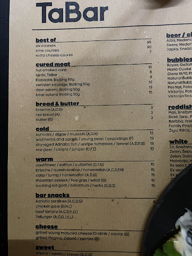 3 of us went to this place that was recommended as a wine destination by a friend that lives in Ljubljana . My son , a colleague and I were in town on business. We are all wine professionals . Between the 3 of us , 2 hold Advanced Degrees at the Court of Masters Sommeliers, One an Advanced Degree at WSET and One is a DipWSET . I can not tell you how disappointed we were . The wine list is horrible . It is littered with a bunch of small wineries majoring in overly acidic and tannic wines . There is seemingly an emphasis on Natural Wines , but what this really means. Is this . Defective Wines masquerading as natural . We tried 3 different wines each and all but one were horrible . Yet , we did try one wine that was really good . Thank God for the nice lady working there . She made an outstanding recommendation. It was a Malvazija from a small producer in Istria , Zaro . I had heard about this producer , but had never tried any of their wines . The 2016 Zaro Malvazija SBS ( Special Barrel Selection ) was a stunner . Quite frankly we were shocked ! I do not remember the price , but my recollection is that it was not unreasonable . It drank like a €100+ bottle of Chenin Blanc from the Alsace Region of France . But it's not ... it's a Malvazija from Slovenia ! If I had to score this wine , I would give it 94+ points ! This place has lots of potential . They need a lot of help with their wine list , but at least on the night that we were there , there was one really good wine . A wine that I had never had before , but will most definitely recommend from here on out , The 2016 Zaro SBS Malvazija . It saved the night for us and if you go to Tabar , it's a wine that I most definitely recommend...
