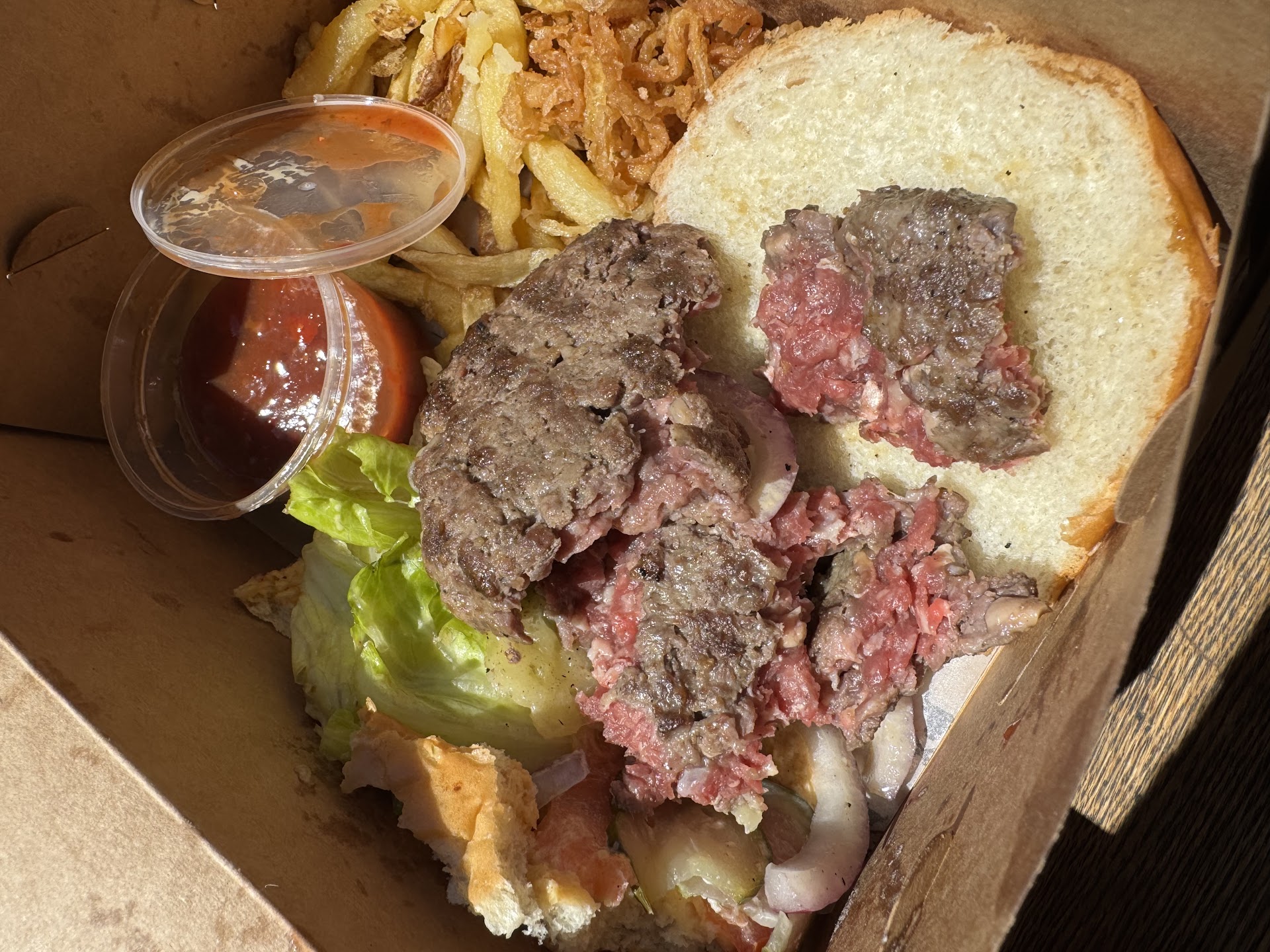 The experience started off poorly with a 30-minute wait just to place our order. Then, we waited another 45 minutes for the food to arriveāonly to find the orders completely wrong. My boyfriend had ordered a medium-cooked hamburger but was served a very rare one instead.