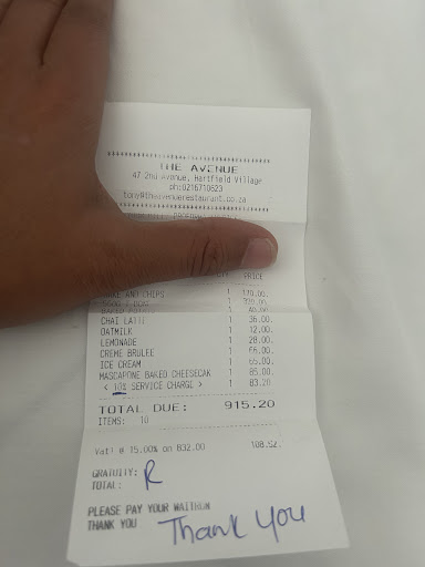 Avenue automatically includes a service charge in their bill. You as a client do not have discretion to decide if the service was good enough to warrant a tip- they just discretely include a 10% charge Irresptive what the bill amount is. There is no signs warning you hereof, it’s just at the bottom of the receipt. On top of that, the waiter wrote an “R” for rands in another line item called tips- tricking you into giving them more money and not disclosing the service charge is already included. So you need to pay the Resturant a service charge and then also the waiter an additional tip. This is absolutely shady, ridiculous, unscrupulous and unacceptable. I have never come across this type of deceit and trickery in a restaurant before. The Resturant charges enough for their meals and then expects you to in addition to pay the wages for the waiters. Then on top of that, the waiters get more tips! What if you don’t want to pay a tip/ service fee if you not happy? You don’t have the choice. But what is most disgusting is the deceit and behavior. The fact that the owner influences this , culture he drives, and is the one responsible. I tried emailing them - there is no direct line to the owner. Staff want to know what the issue is about first and when you tell them I guess the owner says not to reply as I did not get a reply after several follow ups. Eventually we got a response from the owner - he basically brushed things off and said that is how they do business. Utterly disgusted. I will not dine there again, will be telling all my friends and family not to dine there again as well. I am not big on social media but will try and make more ppl aware hereof. I will even check with appropriate authorities if a Resturant can charge you additional costs not related to your meal as they want, hide it in the fine print and not give you any discretion to decide if you want to pay a tip or not- as they make...