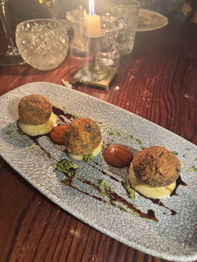 There are multiple rooms, each with its own personality — dark wood floors, opulent vintage armchairs, fireplaces, antique bookshelves, dim chandeliers, and velvet galore. The lighting is low, the music jazzy and intimate, and the vibe deeply romantic without ever feeling pretentious. Even the bathrooms feel like they belong in an eccentric European film.