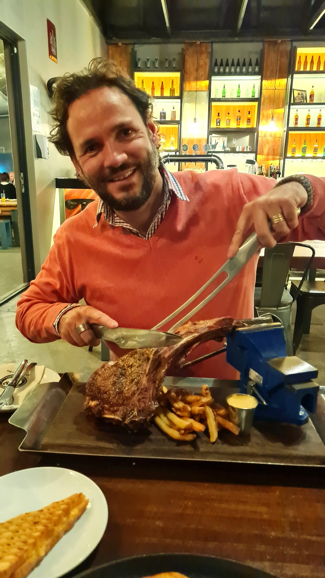 Meat meat and more meat please! I ordered the 1.2kg ribeye clamp steak, which is brought to you table clamped in a vice on a large clean wooden chopping board. The chips, pampoen koekies, carpacio, bobotie rolletjie happies (spring rolls) -I have to add- was frieken amazing :D. And the massive spread of desert choices (especially ice cream) is mouth watering. The cream brulé was out of this world. Maybe from Mars. Loved it!