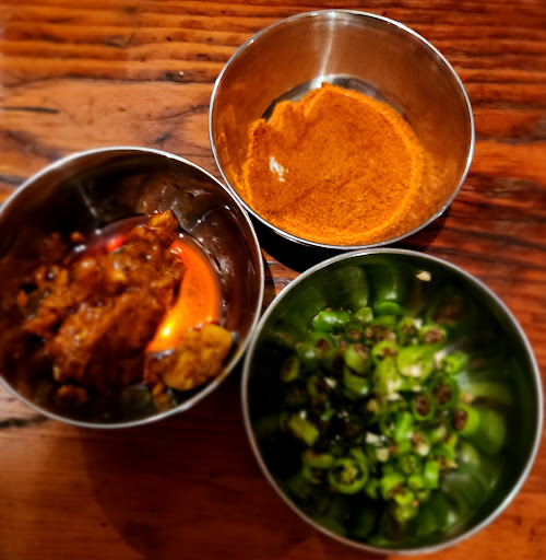The food was heavenly but not enough heat for me... I asked for and was given some chopped green chillies... Raj recommended some chilli powder instead as fresh green chillies would detract from the food authenticity..and so right he was... so it's chilli powder for me from now on for that heat bomb.