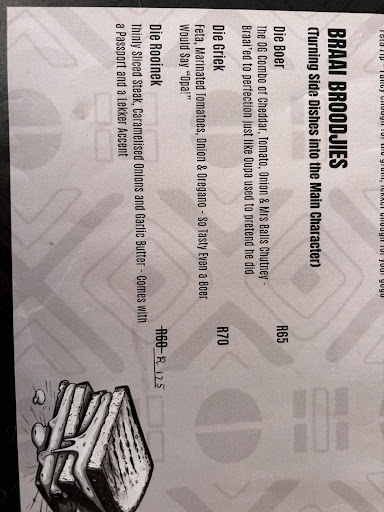 Ā Ā Ā Read moreGood service and great atmosphere, but the food was disappointing. We paid R125 for a biltong braai broodjie that barely had any biltong on itādefinitely not worth the price. The truffle fungi sauce lacked truffle flavor and seasoning and tasted like a basic packet mushroom sauce. The caramelized garlic potatoes were just plain boiled potatoes tossed in heavy garlic butter, with no crispiness or caramelization. The garlic bread was overly salty and loaded with garlic, leaving us feeling sick after sharing a small portion among four people. To top it off, several items on the menu were...