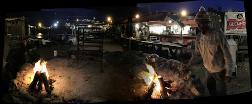The restaurant is spectacular! It's an outdoor dirt-floor space with open walls and many lamps, picnic benches, a bar building, and a big circular cooking pit. In the setting sun, the space and the incandescent light was magical.