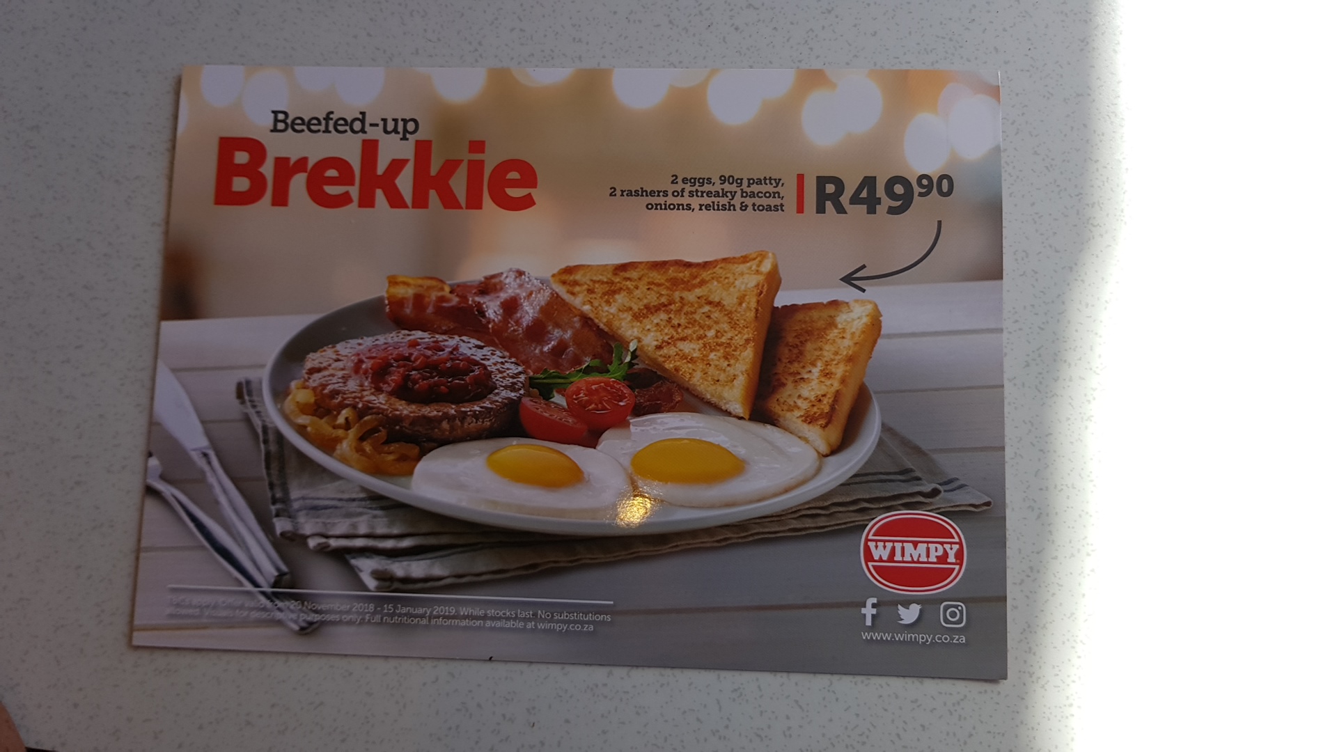 We wanted to enjoy a last breakfast before heading back home, and decided on Wimpy Hartenbos. Once we've arrived, we noticed it was busy, which is perfectly fine. The host guided us to a table in the corner outside. Once we've paged through the menu, which took about 10 minutes, we waited patiently. We've also worked in the service industry, and know how hard it could be to juggle many tables, especially if you're only a handful of waiters. We noticed other patrons being seated and waited upon, even though they arrived after us. My partner stood up to head to the reception desk and remind them we were waiting. The person behind the desk (the host who originally seated us) reassured us that our waiter is on her way.