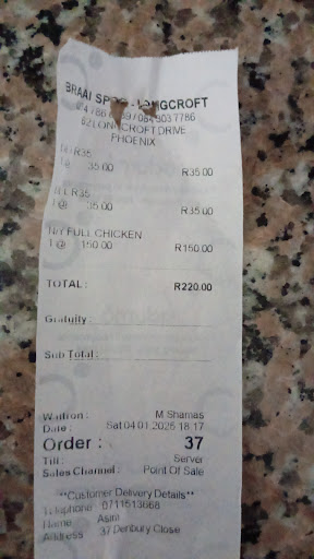 Braai spot used to serve quality food. Ordered a family tikka meal, which to our suprise was ready in 5 minutes. The chicken was cold, dry, tasteless and not fresh. When we went to return almost all of our meal, explained to the manager reasons for returning, he said that there was nothing wrong. We challenged him to taste it, he kept talking above me and refused to listen. His reason for the chicken being tasteless and being ready in 5 minutes was because it was pre-preared as it was a Friday night and they are busy, so they are creating a quick drive by service. Where did you ever hear of tikka being prepared beforehand and being served to customers. Manager was rude, arrogant and we basically told him to keep his food and we won't be giving him our loyal patronage which we have done for so many years. It is sad that the community in general will not complain but just eat what is being served. Braai spot, stop serving loyal customers with inferior quality food and please send your managers for managerial training on how to treat customers with respect. You have just lost your support of this...