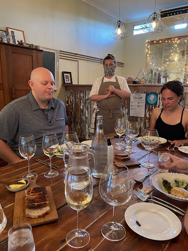 Oh, what a night! After a week in South Africa, we were THRILLED to finish our trip with an evening at Reverie Social Table. Our experience from start to finish was top notch. I reached out with several inquiries before booking our reservations, knowing we had 2 vegans and a tree nut allergy in our party. I wasn't sure if accommodations were possible, and I was assured that knowing that information ahead of time, would make for a delightful evening. So, we booked, and I'm happy to say, all 4 of us said it was our favorite experience of our ENTIRE trip! When entering the restaurant for the evening we were greeted with wine, given time to mingle among the other guests (2 from France, 2 from Dubai/US, 3 from Denmark, 2 from US, and then our party of 2 from the US and 2 from the UK). After happy hour we gathered around Julia's beautiful custom made 18-seater table for the most wonderful 5 course meal. Almost all of the dishes fit everyone's dietary needs (there were 2 meat dishes but Julia prepared gorgeous vegan options for our 2 vegans and 1 vegetarian in the group). My brother said, "You could have convinced me that this aubergine dish was pork belly, and I've never said that about vegan food before!"