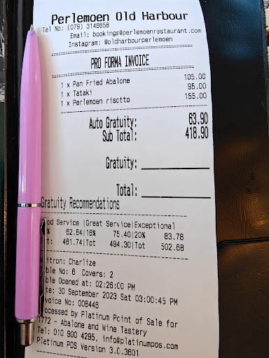 Read moreAfter the positive press we thought to give it a try. We had to reserve by sending a WhatsApp which was duly accepted. When we arrived they could not find our reservation, but was told we could sit anywhere, which we did. The view is spectacular in the Old Harbour of Hermanus. We ordered two glasses of bubbly which was not served exactly cold. We asked about specials and the waiter told us about Cerviche. We wanted to know which fish? He didn't really know and eventually told us Tuna. Not being too sure about this we asked to see the chef. Eventually the other waiter came (with superior attitude) and told us the Cerviche was Perlemoen? We ordered a bottle of Bouchard Finlayson Kaaimansgat which was sublime. We opted for the seafood Platter for 2. At R 500.00 we expected a serving similar to what we get in Portugal in a seafront restaurant. What a let down.! Half the small pan was filled with rice, a small portion of fish, prawns, perlemoen strips and little mussels. We ordered bread at R 75.00 which arrived after the 3rd request and was toasted and bought probably from a local Cafe. We did not stay for coffee or desert. Great location, poor & slow service and average food. Next time we would probably seek the local fish and chips shop, which the owner suggests in one of...